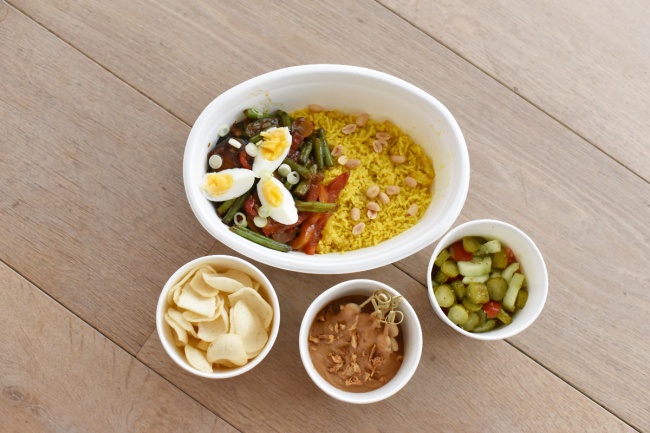 Voor je Giveaway cadeautje kun je de groenten en rijst in een schaal doen van bamboe (voor een habbekrats bij Xenos). Strooi eventueel wat fijngesneden lente-ui en ongezouten pinda's over de maaltijd. Decoreer verder met partjes hardgekookt ei. De overige gerechtjes zoals het komkommer zoetzuur, de limabonen op een stokje in pindasaus en de kroepoek gaan prima in aparte kartonnen bakjes. Sluit alle bakjes goed af met plastic folie en daaroverheen dik aluminiumfolie. Hang er vrolijke kaartjes aan met opwarminstructies. Zet alle bakjes rechtstandig in een papieren cadeautas en breng het voorzichtig naar de geluksvogel(s).