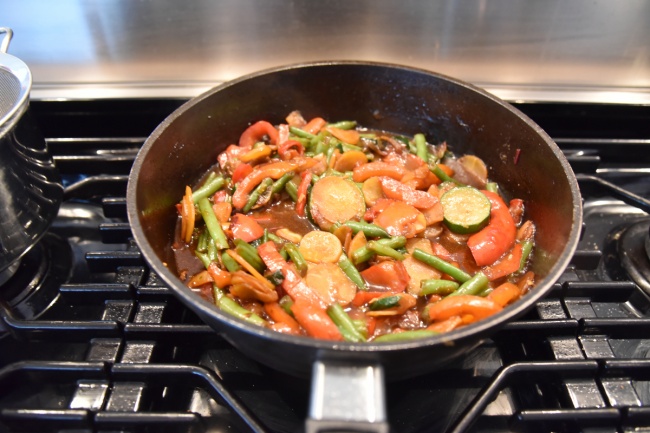 * Verhit 2 eetlepels wokolie in een wok of grote hapjespan en roerbak de ovengroente op hoog vuur. Voeg na 3 minuten de boontjes toe en roerbak nog 5 minuten. Voeg het zakje Samasaya kruidenpasta toe, de ketjap manis, de soyasaus en 2 eetlepels water. Laat op zacht vuur even pruttelen en proef of er nog peper of zout bij moet of wellicht nog wat ketjap of sojasaus. De saus moet smeuïg en royaal zijn. Is het veel te dik en te vast, roer er dan nog wat water door. Is het veel te waterig en dun, doe er dan nog een lepel ketjap bij en eventueel een beetje allesbinder.