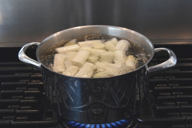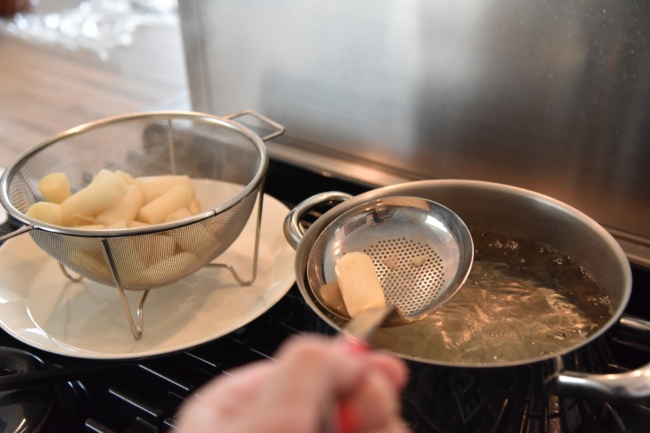 Als het water kookt, doe je de aspergestukken erin en kook ze 5 minuten (een minuutje minder als je dunne asperges hebt) in de pan zonder deksel.