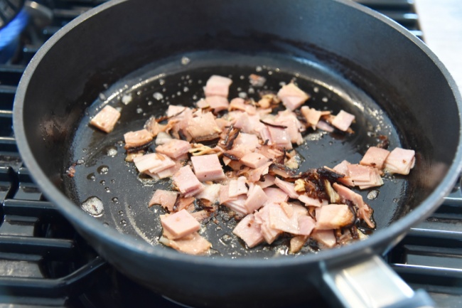 Laat 2 liter water met zout aan de kook komen in een grote pan. Snij ondertussen de plakjes beenham in repen en de repen in stukjes.