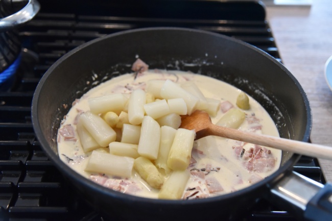 Heb je geen tijd om asperges te schillen, of vind je het een vervelend klusje, koop ze dan geschild. Dat hebben wij van Prakkie ook gedaan en daardoor is dit gerecht al in een kwartiertje klaar.