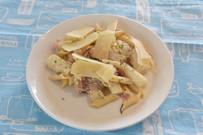 Giet de penne af, laat even uitlekken en roer direct door de warme saus. Schep het gerecht op een bord, garneer eventueel met peterselie en verdeel de geschaafde kaas over de borden. Serveer direct.